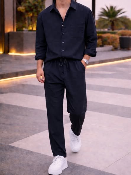 Sjell një pamje të pastër, moderne dhe mashkullore me këtë set premium për meshkuj, i përbërë nga këmisha me prerje të lirshme dhe pantolla komode me bel elastik dhe lidhëse. I krijuar për meshkujt që duan të duken elegant pa hequr dorë nga rehatia, ky set është ideal për dalje të përditshme, mbrëmje verore, pushime, shëtitje dhe kombinime smart-casual.