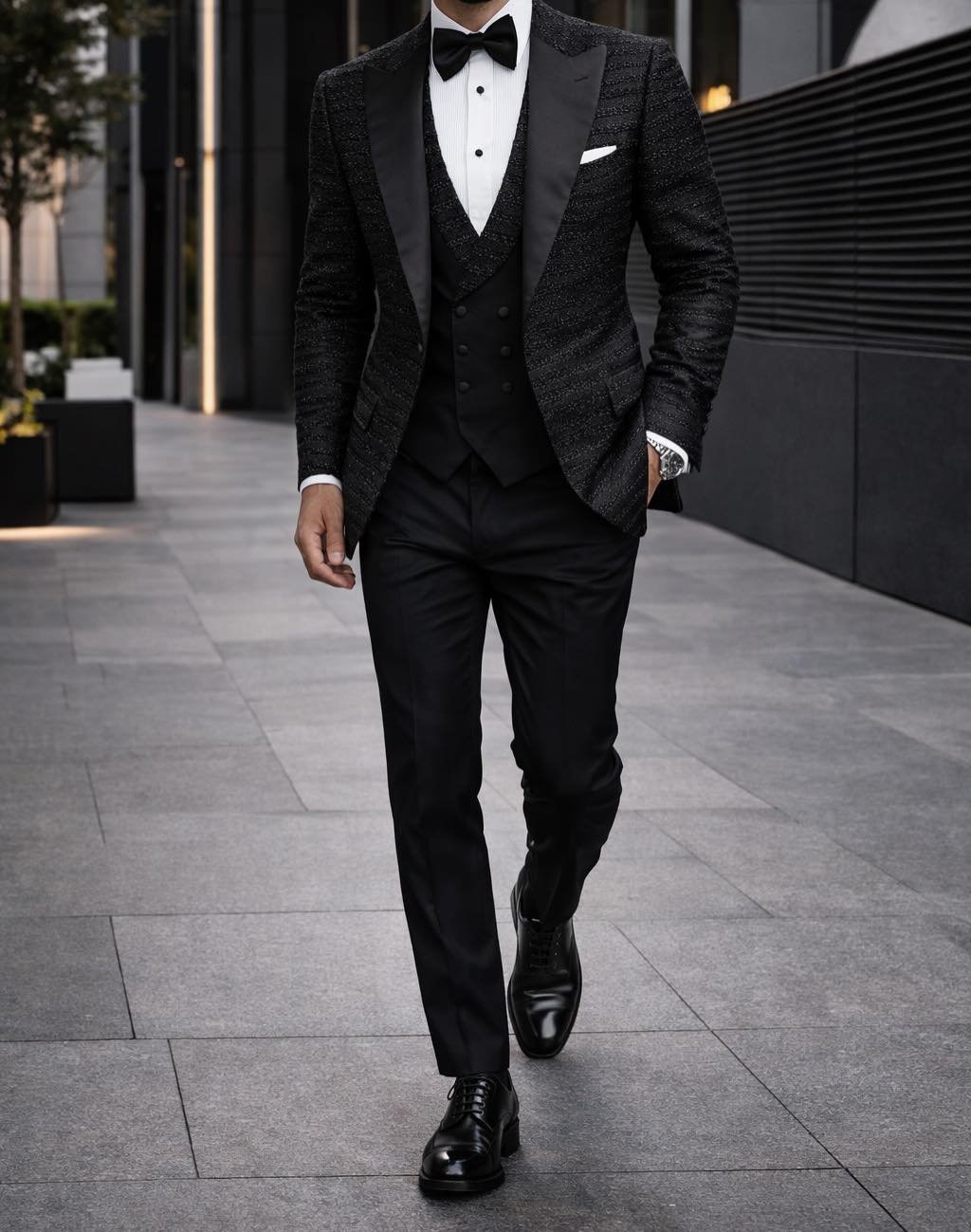 Ky smoking luksoz 3-pjesësh në ngjyrë të zezë është krijuar për meshkujt që kërkojnë një paraqitje të nivelit të lartë në evente prestigjioze. Me një kombinim perfekt të elegancës klasike dhe detajeve moderne, ky set përfshin xhaketë, jelek dhe pantallona të dizajnuara për një siluetë të pastër dhe të sofistikuar.