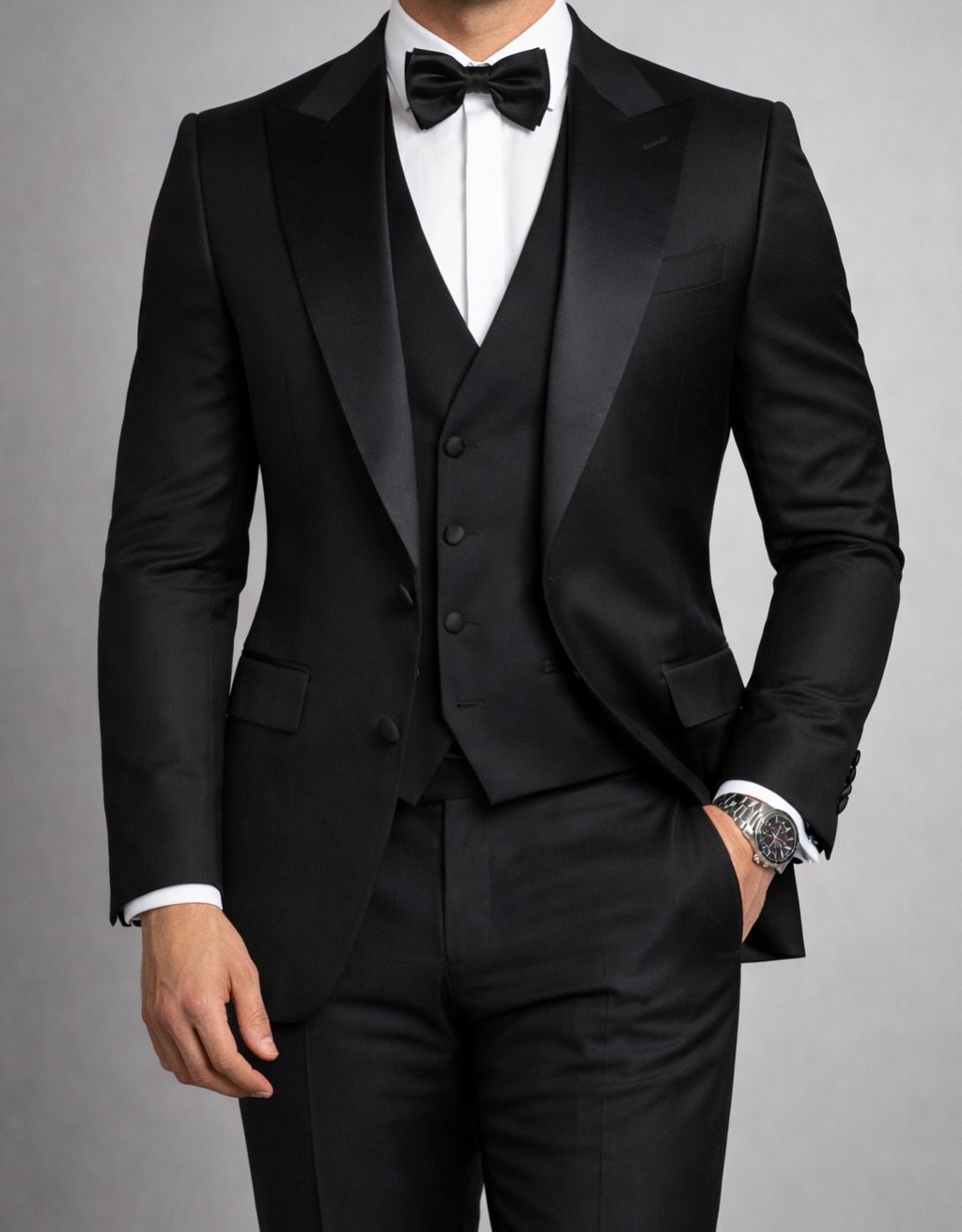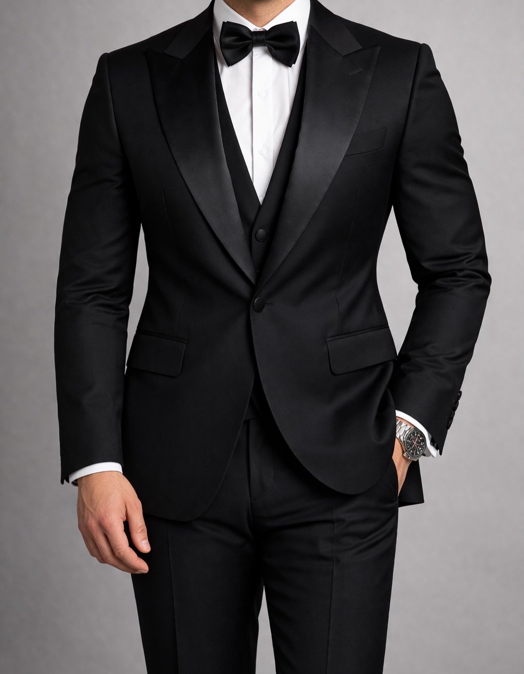 Nje zgjedhje ikonike për mashkullin që kërkon klas absolut dhe elegancë të nivelit më të lartë. Ky smoking i zi 3-pjesësh është krijuar për evente speciale ku pamja duhet të jetë perfekte, e pastër dhe imponuese. Me prerje të rafinuar, jelek elegant, papion klasik dhe detaje satin në jaka, ky model sjell luks, finesë dhe prezencë të fortë në çdo dalje.
