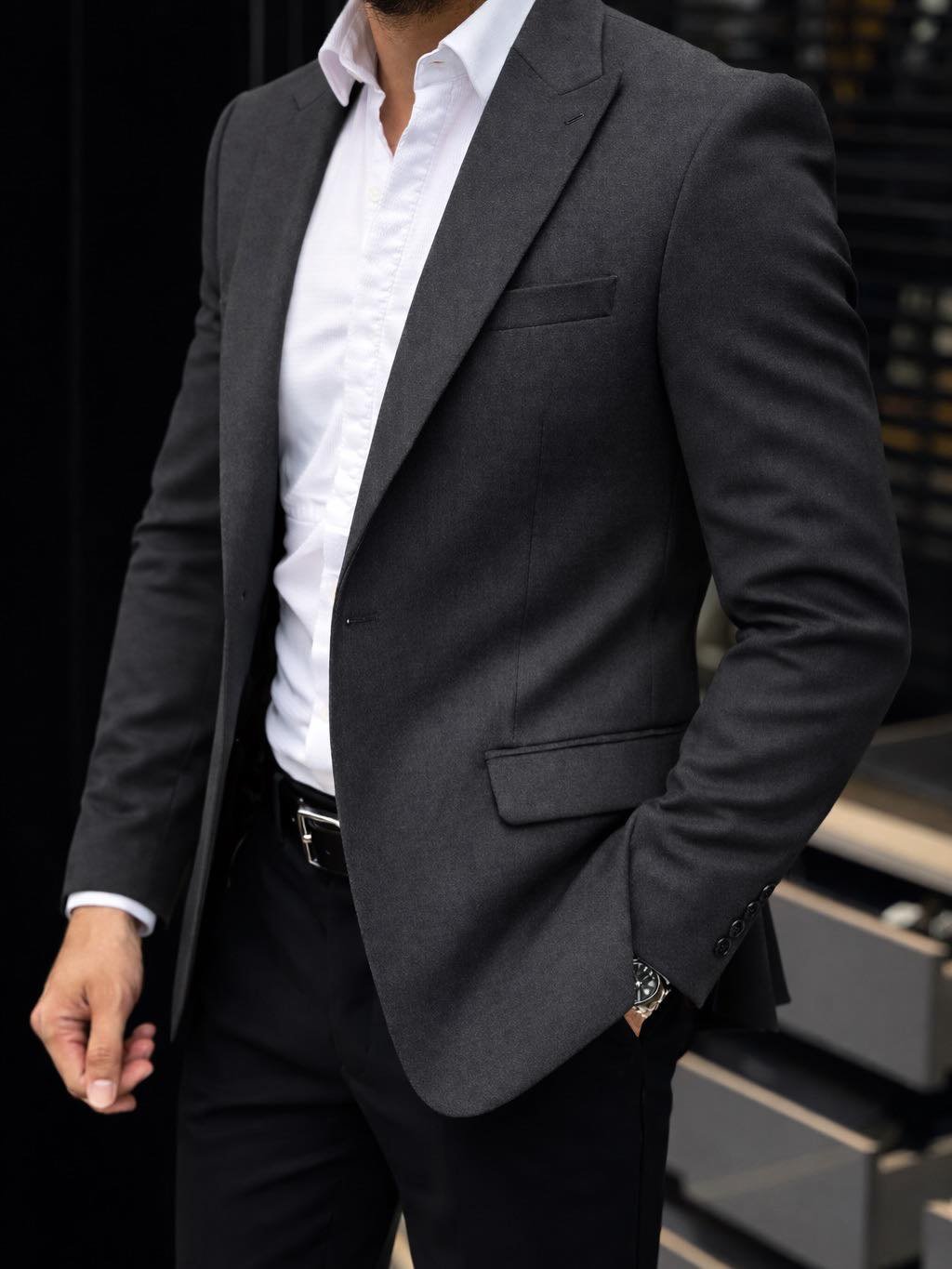 Kjo xhaketë në ngjyrë antracit është një zgjedhje ideale për një paraqitje moderne dhe profesionale. Me dizajn minimalist dhe prerje slim-fit, ajo ofron një pamje të pastër dhe të rafinuar. Ngjyra antracit sjell një alternativë elegante ndaj së zezës, duke ruajtur seriozitetin dhe klasën. E kombinuar me këmishë të bardhë, krijon një kontrast të balancuar dhe shumë stil.