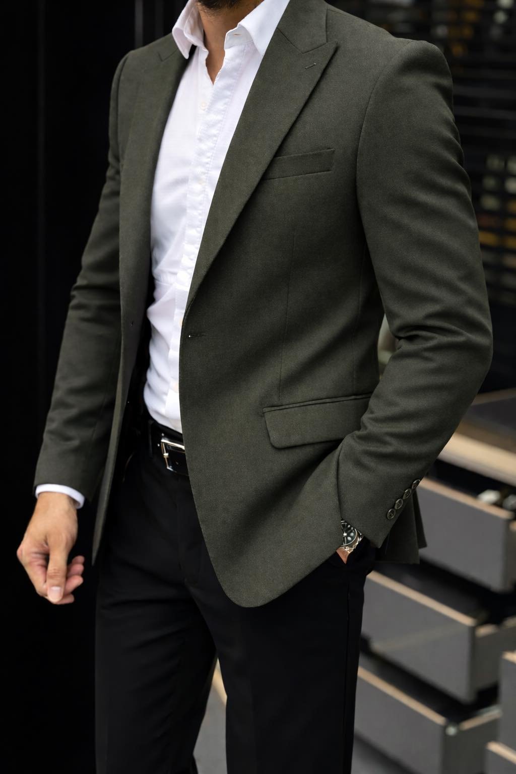 Kjo xhaketë në ngjyrë jeshile olive përfaqëson një stil të rafinuar dhe bashkëkohor, ideal për meshkujt që kërkojnë elegancë me një prekje unike. Dizajni minimalist me një kopës të vetëm dhe prerja slim-fit krijojnë një siluetë të pastër dhe moderne. Kombinimi me këmishë të bardhë ofron një kontrast elegant dhe të balancuar, perfekt për çdo ambient.