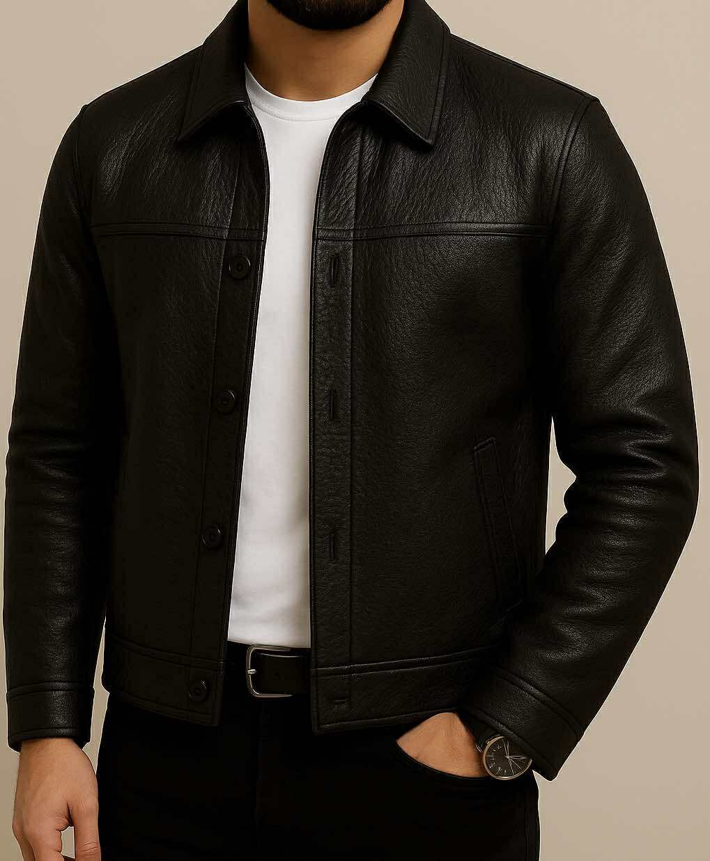 Xhaketë elegante prej Lëkure Artificiale në ngjyrë të zezë me dizajn klasik me kopsa. Materiali i jashtëm cilësor me teksturë natyrale ofron qëndrueshmëri dhe një pamje premium. Prerja standarde dhe linjat e pastra e bëjnë këtë xhaketë të gjithanshme, të përshtatshme si për stil urban ashtu edhe për kombinime më elegante. Kombinohet lehtësisht me një T-shirt bazik apo këmishë për një look modern dhe të sofistikuar.