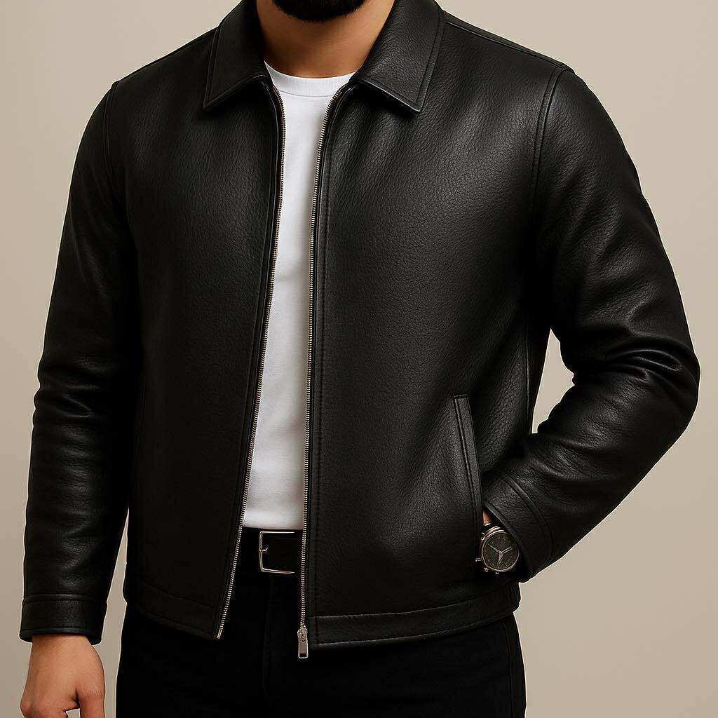 Xhaketë elegante prej lëkure në ngjyrë të zezë me dizajn klasik dhe jakë tradicionale. Zinxhiri i plotë qendror e bën praktik dhe modern, ndërsa materiali i jashtëm cilësor me teksturë natyrale ofron qëndrueshmëri dhe pamje premium. Kombinimi i linjave të pastra dhe stilit minimalist e bën këtë xhaketë të gjithanshme, të përshtatshme si për përdorim urban të përditshëm, ashtu edhe për kombinime smart-casual.