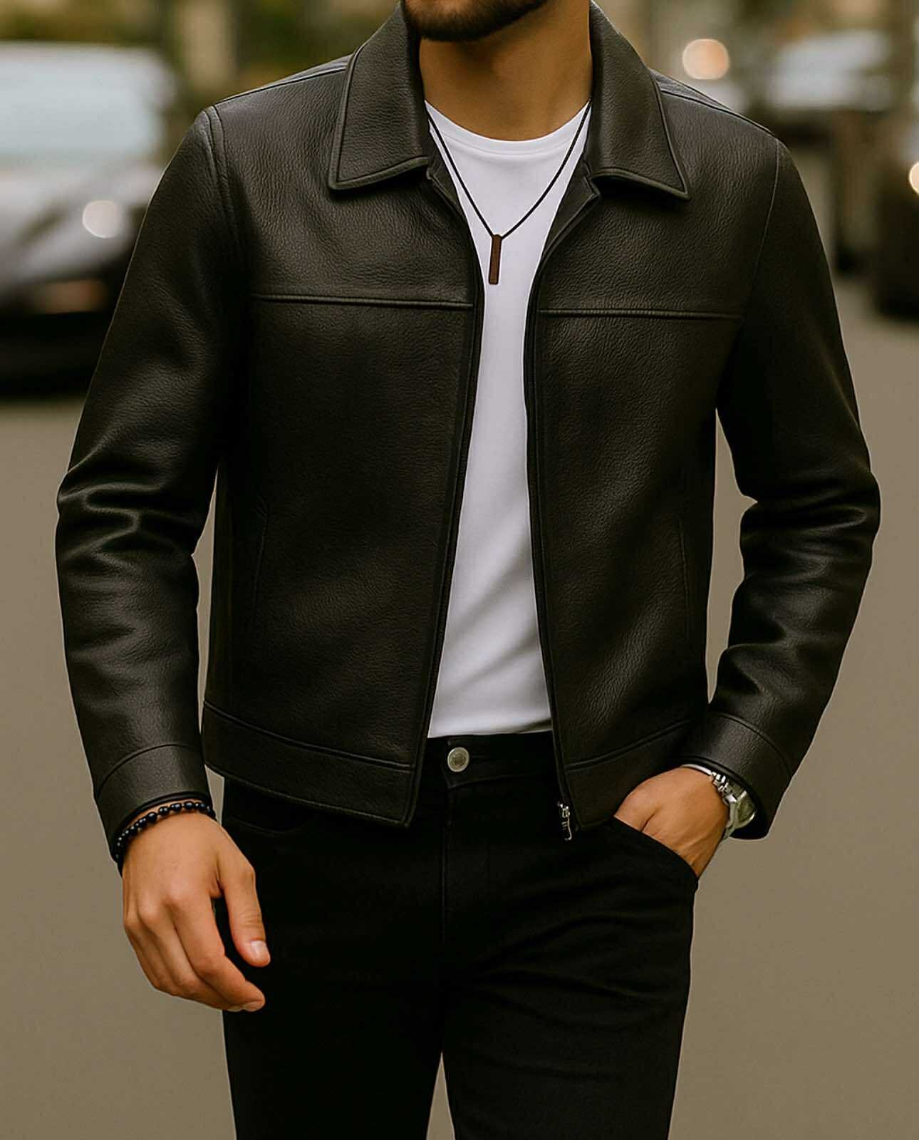 Kjo xhaketë lëkure e zezë me teksturë të theksuar është një zgjedhje premium për meshkujt që duan të dallohen me stil. Me një dizajn minimalist, por me detaje elegante, ajo kombinon praktikën dhe luksin duke u bërë një pjesë kyçe e garderobës urbane.