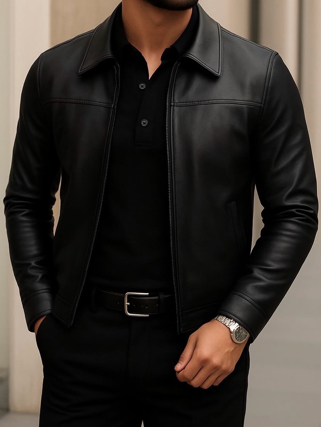 Një xhaketë lëkure elegante në ngjyrë të zezë, e dizajnuar për mashkullin që kërkon stil të fortë, minimal dhe modern. Me prerje slim fit dhe linja të pastra, kjo xhaketë krijon një siluetë të strukturuar dhe mashkullore, perfekte për kombinime “total black” apo smart-casual.