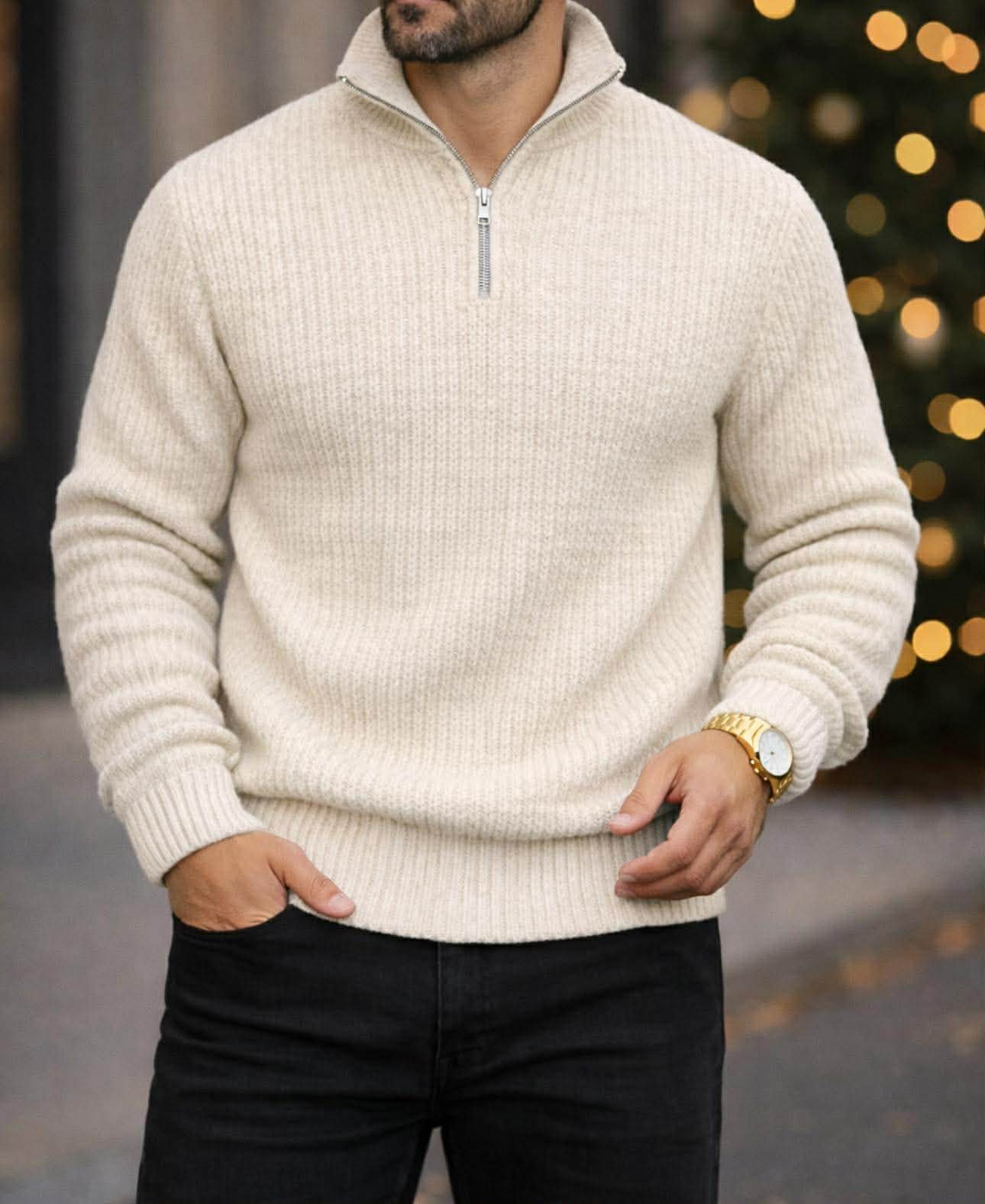 Xhemper elegant dhe shumë i rafinuar për meshkuj, me dizajn modern half-zip dhe strukturë të thurur ribbed, që ofron rehati maksimale dhe pamje premium. Ngjyra off-white (e bardhë krem) i jep një stil të pastër, luksoz dhe minimalist, perfekt për kombinime elegante apo smart-casual. Jakë me zinxhir metalik shton një detaj modern, ndërsa prerja e rregullt përshtatet bukur në trup.