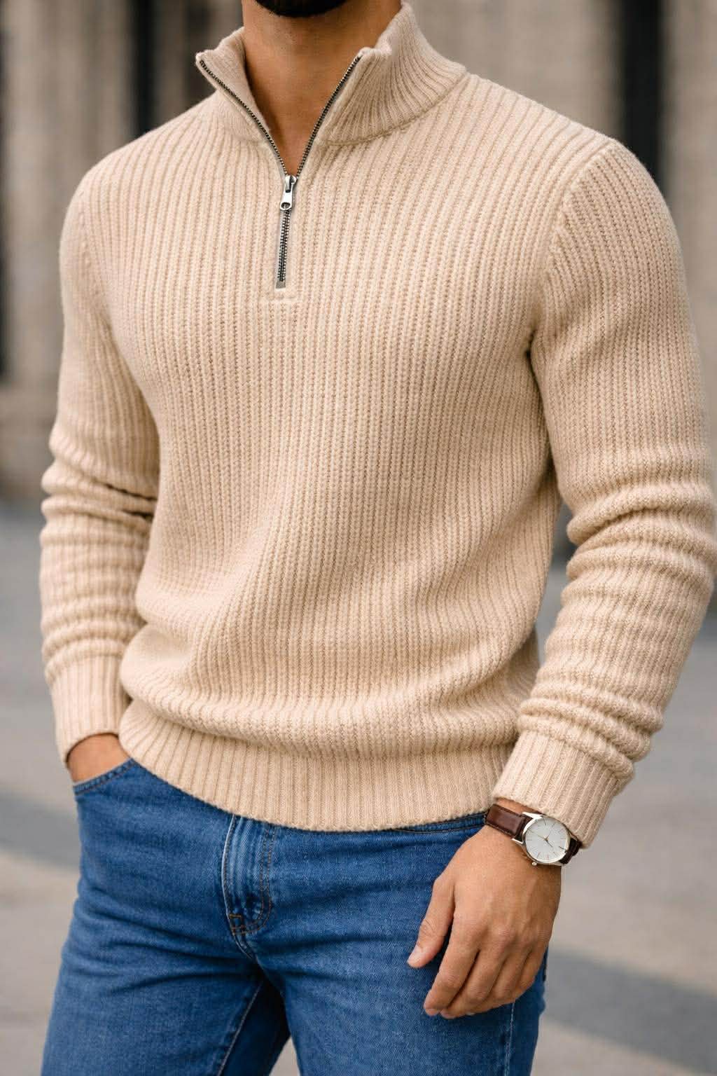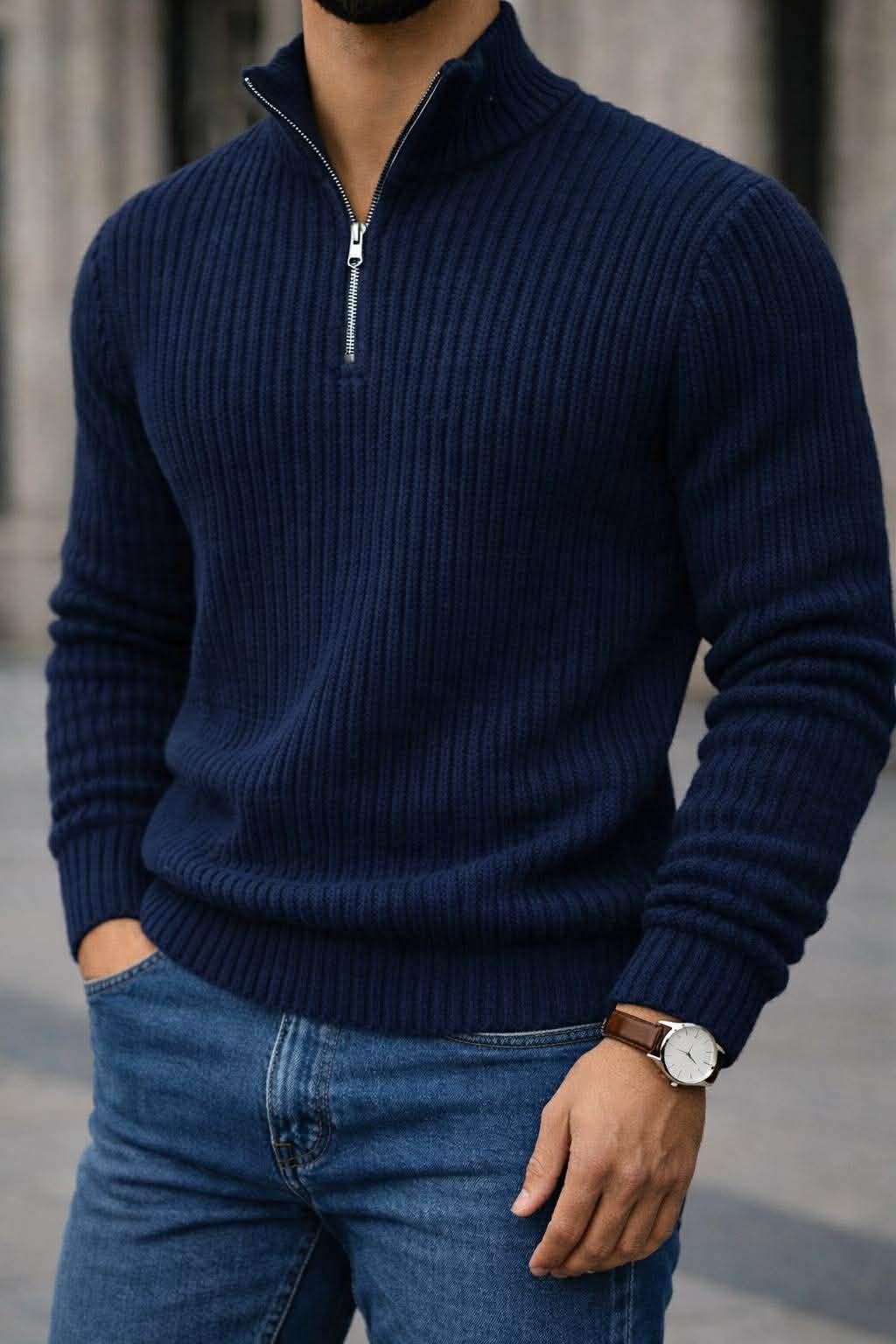 Xhemper elegant dhe modern me dizajn half-zip, i punuar me thurje rib për një pamje premium dhe ndjesi komode gjatë gjithë ditës. Materiali cilësor ofron ngrohtësi, elasticitet dhe rehati, ndërsa prerja moderne thekson trupin pa e ngushtuar. Zinxhiri metalik shton karakter dhe lejon kombinime të ndryshme – i hapur për stil casual ose i mbyllur për pamje më elegante.
