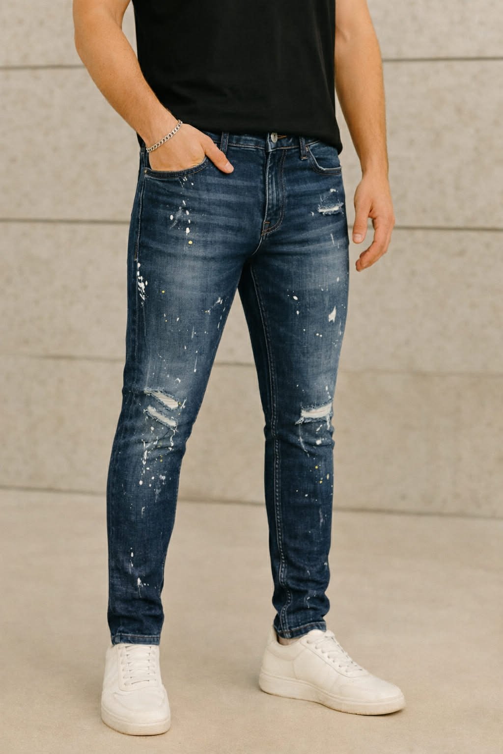 Xhinse elegante për meshkuj me prerje slim fit, të punuara nga denim blu i errët cilësor, që ofron kombinimin perfekt mes stilit modern dhe rehatisë. Dizajni përfshin detaje ripped diskrete dhe efekt paint splash, të shpërndara në mënyrë të balancuar për një pamje urbane, por të pastër.