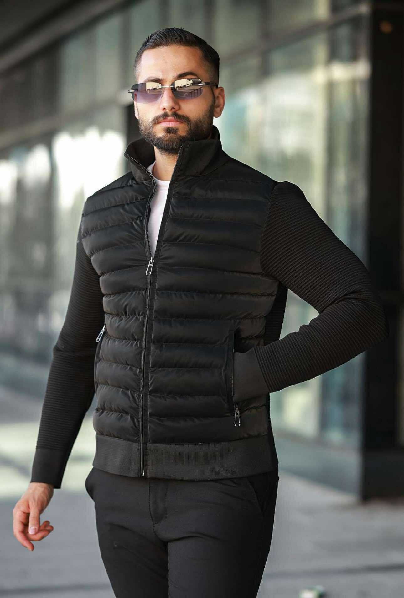 Ky xhup bomber slimfit në ngjyrë të zezë përfaqëson elegancën urbane dhe stilin modern. Pjesa e përparme me panele horizontale të mbushura ofron ngrohtësi dhe rehati, ndërsa mëngët me teksturë unike e bëjnë të dallohet nga modelet klasike. Jakë e lartë, zinxhir cilësor dhe xhepat anësorë funksionalë e bëjnë këtë xhup jo vetëm estetik, por edhe praktik për përditshmërinë.