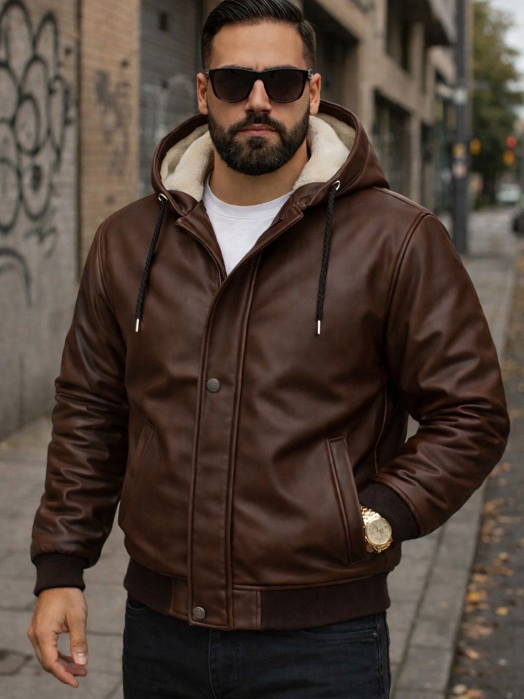Ky xhup prej eco-leather në ngjyrë kafe është thelbi i stilit urban dhe elegancës moderne. Me sipërfaqe me shkëlqim të lehtë, kapuç praktik dhe pelush të brendshëm për ngrohtësi maksimale, ai ofron pamje luksoze dhe rehati në çdo moment. Kombinimi perfekt mes funksionalitetit dhe stilit e bën ideal për pamje street-style ose casual premium.