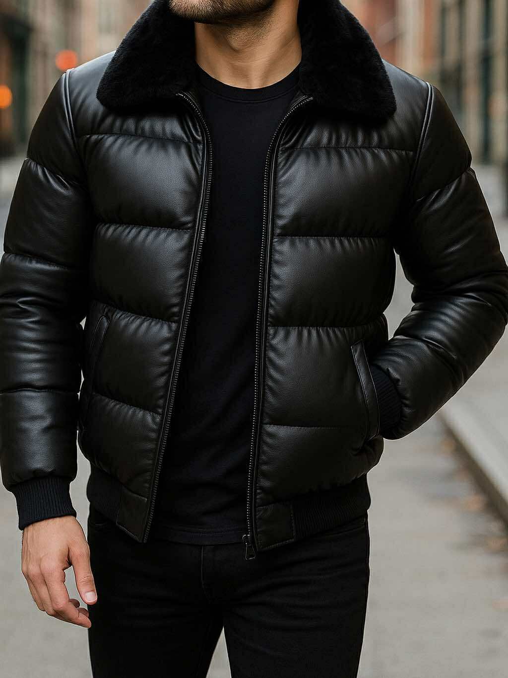 Xhup puffer premium i punuar nga eco-lekurë me shkëlqim të butë, me jakë pelushi të zi për një pamje luksoze dhe të sofistikuar.