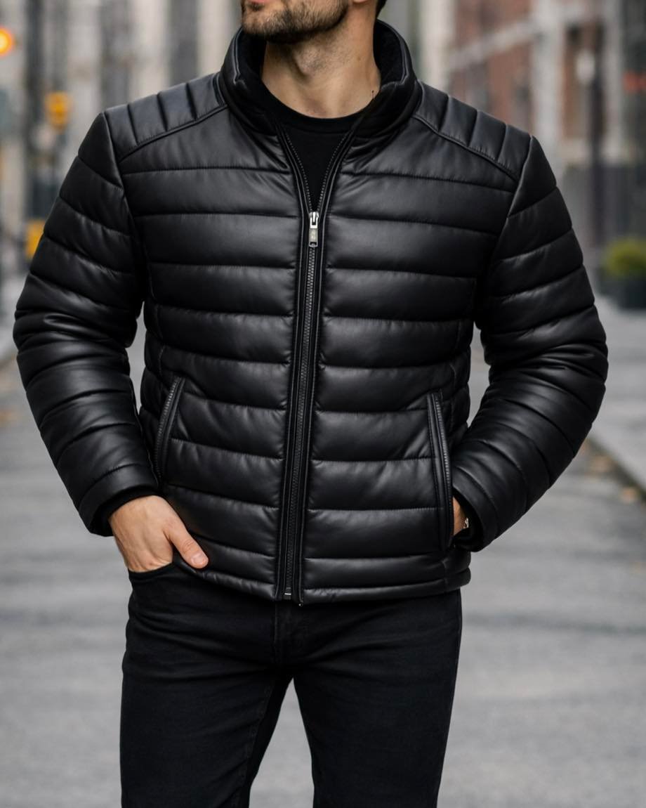 Xhup puffer modern për meshkuj, i prodhuar nga eco-lëkurë premium me teksturë të butë dhe pamje elegante matte. Dizajni minimalist në ngjyrë të zezë klasike e bën këtë xhup zgjedhje ideale për çdo kombinim urban apo casual.